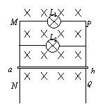 如图所示,竖直平面内有两根很长的金属导轨MN、PQ,处于B = 0.5 T的水平匀强磁场中,两导轨中连有两个电阻均为0.2Ω.额定功率均为5 W的小灯泡,如图所示.质量m =50 g、长L= 0.5 m、电阻r=0.2 Ω的金属棒ab可沿导轨做无摩擦滑动,导轨电阻不计.导轨与金属棒接触始终良好。则: