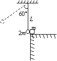 如图所示,有一质量为m的物块静止在水平桌面左端,长为L的细线竖直悬挂一个质量为2m的小球,小球刚好与物块接触。现保持细线绷直,把小球拉向左上方使细线与竖直方向成600夹角,无初速释放,小球运动到最低点时恰与物块正碰,碰后小球继续向右摆动,上升的最大高度为 (整个过程中小球不与桌面接触),物块在桌面上向右滑行了L后静止,求物块与水平桌面间的动摩擦因数µ.