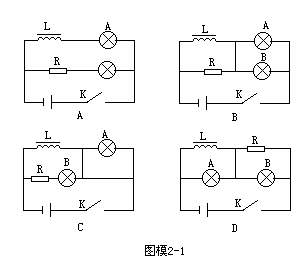 1.两个相同的灯泡A、B,自感线圈的直流电阻与定值电阻的阻值相等,由灯泡、线圈、电阻组成图模2-1所示的电路,在电键K闭合的瞬间,A灯比B灯亮的电路是 [ ]