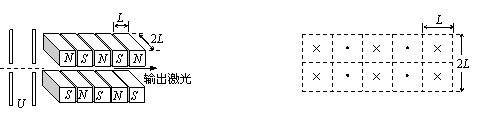 (20分)如左图所示,是一种自由电子激光器的原理图。经电场加速后的高速电子束,射入上下排列着许多磁铁的管中。相邻两块磁铁的极性是相反的。电子在垂直于磁场的方向上摆动着前进,电子在摆动的过程中发射出光子。管子两端的反光镜(图中未画出)使光子来回反射,光子与自由电子发生相互作用,使光能量不断增大,从而产生激光输出。⑴若该激光器发射激光的功率为P=6.63×109W,激光的频率为ν=1.0×1016Hz。则该激光器每秒发出多少个激光光子?(普朗克常量h=6.63×10-34Js)⑵若加速电压U=1.8×104V,取电子质量m=9×10-4T。每个磁极的左右宽度为L=30cm,厚度为2 L。忽略左右磁极间的缝隙距离,认为电子在磁场中运动的速度大小不变。电子经电场加速后,从上下磁极间缝隙的正中间垂直于磁场方向射入第1对磁极的磁场中,电子一共可通过几对磁极?在右图的俯视图中,画出电子在磁场中运动的轨迹的示意图(尺寸比图甲有放大)。