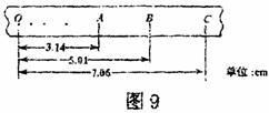 15.在“验证机械能守恒定律”的实验中,打点计时器所用电源频率为50Hz,当地重力加速度的值为9.80m/s2,测得所用重物的质量为1.00kg,若按实验要求正确量得连续三点A、B、C到第一个O点的距离如图9所示(相邻计数点时间0.02s),那么,