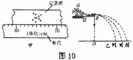 上靠近槽末端的地方,让A球仍从位置G由静止滚下,和B球碰撞后,A、B球分别在记录纸上留下各自的落点痕迹。重复这种操作10次。图中O点是水平槽末端R在记录纸上的垂直投影点。B球落点痕迹如图10甲所示,其中米尺水平放置,且垂直于G、R、O所在的平面,米尺的零点与O点对齐。