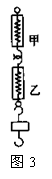 4. 如图3,两轻质弹簧和质量均为m的外壳组成甲、乙两个弹簧秤,将提环挂有 质量为M的重物的乙秤倒挂在甲的挂钩上,某人手提甲的提环,向下做加速 度a=0.25g的匀加速运动,则下列说法正确的是( )
