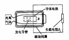相连。整个发电导管处于图9中磁场线圈产生的匀强磁场里,磁感应强度为B,方向如图所示。发电导管内有电阻率为