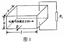 例10:(04年天津理综25)磁流体发电是一种新型发电方式,图8和图9是其工作原理示意图。图8中的长方体是发电导管,其中空部分的长、高、宽分别为
