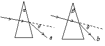 例2.如图所示,有 a、b两束单色光(一束是红光一束是紫光)分别垂直于同种介质材料做成的两个不同顶角的三棱镜的一个腰射入,从另一个腰射出后,测得它们的偏折角θ大小相同。两个三棱镜的顶角分别为α、β且α<β,下列说法中正确的是