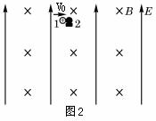 [例6].(四川理综卷)如图2所示,在足够大的空间范围内,同时存在着竖直向上的匀强电场和垂直纸面向里的水平匀强磁场,磁感应强度B=1.57T.小球1带正电,其电量与质量之比q1/m1=4 C/kg,所受重力与电场力的大小相等;小球2不带电,静止放置于固定的水平悬空支架上。小球向右以v0=23.59 m/s的水平速度与小球2正碰,碰后经过0.75 s再次相碰。设碰撞前后两小球带电情况不发生改变,且始终保持在同一竖直平面内。(取g=10 m/s2)问(1)电场强度E的大小是多少?(2)两小球的质量之比