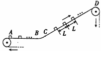 一传送带装置示意如图2所示,其中传送带经过AB区域时是水平的,经过BC区域时变为圆弧形(圆弧由光滑模板形成,未画出),经过CD区域时是倾斜的,AB和CD都与BC相切。现将大量的质量均为m的小货箱一个一个在A处放到传送带上,放置时初速为零,经传送带运送到D处,D和A的高度差为h。稳定工作时传送带速度不变,CD段上各箱等距排列,相邻两箱的距离为L。每个箱子在A处投放后,在到达B之前已经相对于传送带静止,且以后也不再滑动(忽略经BC段时的微小滑动)。已知在一段相当长的时间T内,共运送小货箱的数目为N。这装置由电动机带动,传送带与轮子间无相对滑动,不计轮轴处的摩擦。求电动机的平均抽出功率
