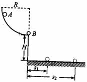 19.(11分)如图,位于竖直平面内的四分之一光滑圆弧轨道半径为R。轨道底端距地面的高度为H。质量为m的B球静止在圆弧轨道的底端。将质量为M的A球从圆弧轨道上的某点由静止释放。它沿轨道滑下后与B球发生正碰。A、B两球落地时,水平通过的距离分别是s1和s2。已知M>m,重力加速度为g.。不计空气阻力。