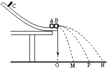 (7分)用半径相同的两个小球A、B的碰撞验证动量守恒定律,实验装置示意如图,斜槽与水平圆滑连接。实验时先为放B球,使A球从斜槽上某一固定点C由静止滚下,落到位于水平地面的记录纸上留下痕迹,再把B球静置于水平槽前边缘处,让A球仍从C处由静止滚下,A球和B球有前科后分别落到O点的距离:OM=2.68cm,OP=8.62cm,ON=11.50cm,并知A、B两球的质量比为2∶1,则未放B球时A球落地点是记录纸上的___点,系统碰撞总动量p与碰撞后动量p/的百分误差