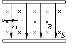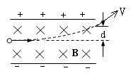 一带电量为+q,质量为m的粒子经加速电场(加速电压为U)加速后,垂直进入相互垂直的匀强电场和匀强磁场,电场E方向竖直向下,磁场方向垂直纸面向里,测出该粒子离开场区时的速度大小为V(不计重力),求粒子离开场区时偏离原方向的距离d。