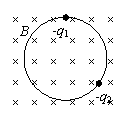 12.在匀强磁场中有一个带电为-q,质量为m1的粒子沿半径为r的圆周作匀速圆周运动,磁场方向垂直于纸面向里。运动中与另一个静止在圆周上带电量也为-q,质量为m2的粒子相碰后,合为一体在半径为r2的竖直圆周作匀速运动,