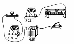 (2).用如下图中所给的实验器材测量一个“12V,5W”的小灯泡在不同电压下的功率,其中电流表有3A、0.6A两挡,内阻可忽略;电压表有15V、3V两挡,内阻很大.测量时要求加在灯泡两端的电压可持续地从0调到12V.按要求在实物图上连线(其中部分线路已经连好).