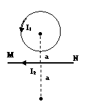 3A.半径为r、电流为I1的通电圆环圆心处的磁感强度为B,在圆环下方距圆心a处水平放置一根电流为I2的无限长直导线MN时,圆环圆心处的磁感强度变为零。设圆环平面和长直导线在同一竖直平面内,如图所示.根据对称性,直导线电流I2在导线下方距导线a处产生的磁感强度的大小为________,方向_____________。