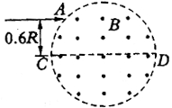 (14分)匀强磁场分布在半径为R的圆内,磁感应强度为B,CD是圆的直径.质量为m、电量为q的带正电的粒子,由静止开始经加速电场加速后,沿着与直径CD平行且相距0.6R的直线从A点进入磁场,如图所示.若带电粒子在磁场中运动的时间是(πm)/(2qB).求加速电场的加速电压.