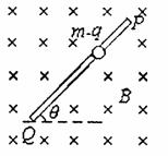 19.(16分)PQ为一根足够长的绝缘细直杆,处于竖直的平面内,与水平夹角为θ斜放,空间充满磁感应强度B的匀强磁场,方向水平如图所示。一个质量为m,带有负电荷的小球套在PQ杆上,小球可沿杆滑动,球与杆之间的摩擦系数为μ(μ<tgθ),小球带电量为q。现将小球由静止开始释放,试求小球在沿杆下滑过程中: