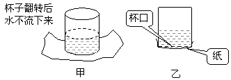 22. (12分)大家都知道:用一个杯口光滑平整的玻璃杯盛满水,然后盖上平整的玻璃板,用手摁住玻璃板迅速翻转,松开托住玻璃板的手,由于大气压的原因,玻璃板不会掉下。一个同学在回家后自己也想做这个实验。由于家中没有玻璃板,他就找了一张普通的纸盖在了杯口光滑平整的玻璃杯上,而且杯中只放了一半的水。按住纸翻转杯子、松开手,他惊呆了:水居然不流下来,如图甲所示。已知玻璃杯粗细均匀,杯子内底部到杯沿的高度为12×10-2m,杯中水的高度为6×10-2m,大气压强为1.013×105Pa。该同学在经过仔细观察后发现,翻转后,纸略往下凸,其平均下凸高度为0.35×10-3m(见乙图)。你能说明水不流下来的原因吗?