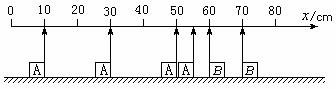 ,而闪光本身持续时间极短。在这4次闪光的瞬间,A、B两滑块均在0-80cm刻度范围内,且第一次闪光时,滑块A恰好在