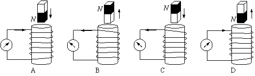 7. 下图是验证楞次定律实验的示意图,竖直放置的线圈固定不动,将磁铁从线圈上方插入或拔出,线圈和电流表构成的闭合回路中就会产生感应电流.各图中分别标出了磁铁的极性、磁铁相对线圈的运动方向以及线圈中产生的感应电流的方向等情况,其中表示正确的是