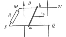 ( 12 分)如图所示, PQ 、MN 是固定的水平放置的足够长的 U 形金属导轨,导轨的宽度为 L ,整个导轨处于竖直向上、磁感应强度为 B 的匀强磁场中,导轨左端连接一阻值为 R 的电阻器,在导轨上放一质量为 m 的金属棒 ab ,导轨与金属棒电阻均不计,给 ab 一水平初速度 v0