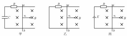 下列三图中除导体棒ab可动外,其余部分均固定不动,甲图中的电容器C原来不带电。设导体棒、导轨和直流电源的电阻均可忽略,导体棒和导轨间的摩擦也不计。图中装置均在水平面内,且都处于方向垂直水平面(即纸面)向下的匀强磁场中,导轨足够长。今给导体棒ab一个向右的初速度
