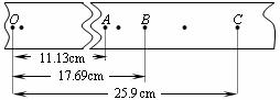 (2)选出一条纸带如图所示,其中O点为起始点,A、B、C为三个计数点,打点计时器通以50HZ交流电,用最小刻度为mm的刻度尺,测得OA=11.13cm,OB=17.69cm,OC=25.9cm。这三个数据中不符合有效数字要求的是 ,应该写成 cm。