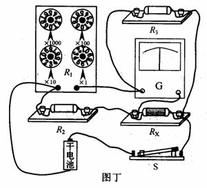 Ⅱ.第二组同学利用和图丁的电路测量,其中R1是电阻箱,R2 = 72Ω 、R3 =100Ω.合上S ,当R1未调至图中所示阻值时,灵敏电流计G 的指针会偏转,将R1调至如图中所示时,灵敏电流计的指针回到零位