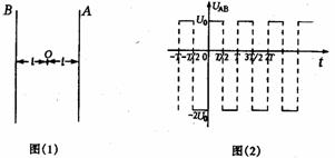 在图(l)中 A和B是真空中的两块面积很大的平行金属板,A、B间的电压 UAB随时间变化的规律如图(2)所示,在图(1)中O点到A和B的距离皆为l,在O处不断地产生电荷量为q、质量为m的带负电的微粒,在交变电压变化的每个周期T内,均匀产生300个上述微粒,不计重力,不考虑微粒之间的相互作用,这种微粒产生后,从静止出发在电场力的作用下运动,设微粒一旦碰到金属板,它就附在板上不再运动.且其电量同时消失,不影响A、B板的电势。已知上述的T=1.2×10-2s.U0=1.2×103