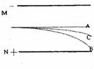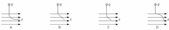2.如图所示,带正电的小球从某一高度开始做自由落体运动,在途中遇到水平向右的匀强电场,则其运动轨迹大致是图中的( )![]()