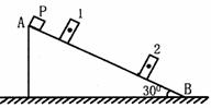 现利用图所示装置验证机械能守恒定律。图中AB是固定的光滑斜面,斜面的倾角为300,1和2是固定在斜面上适当位置的两个光电门,与它们连接的光电计时器都没有画出。让滑块从斜面的顶端滑下,光电门1、2各自连接的光电计时器显示的挡光时间分别为5.00×10-2s、2.00×10-2s。已知滑块质量为2.00kg,滑块沿斜面方向的宽度为5.00cm,光电门1和2之间的距离为0.540m,g=9.80m/s2,取滑块经过光电门时的速度为其平均速度。