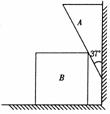 (12分)如图所示,楔状物体A质量为m,尖劈角37°,方形物体B质量为M。开始时B在水平面上靠在竖直墙边,让A从B与墙的缝隙间插入,从静止开始运动,所有的接触面均光滑,求在A、B运动过程中A的斜面与B接触处的弹力。
