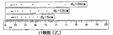 17.某探究小组设计了如下的探究橡皮筋的弹性势能与拉长量之间关系的实验:将一块长木板放在桌面上调至水平,橡皮筋一端固定在墙上,另一端被静止的小车拉长d,小车释放后沿长木板运动,带动穿过打点计时器的纸带运动,如图(甲)所示,打点计时器电源频率为50Hz,小车质量为0.2kg,实验进行了三组,各次实验小车由静止开始运动的位置不同(即橡皮筋的拉长量d不同),分别打出纸带,选择了三种类型的纸带如图(乙)所示(图中最下面的是直尺)。实验中的重要一步是根据纸带数据确定橡皮筋拉动小车的最大速度Vm。下表是某同学记录的有关数据,并进行了部分计算,请帮他完成表中剩下的部分。