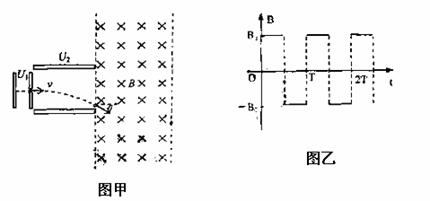 (2)微粒离开偏转电场后接着进入一个按图乙规律变化的有界磁场中,磁场左右边线在竖直方向上,已知磁感应强度的大小为B0,取微粒刚进入磁场时为t=0时刻,此时磁场方向垂直于纸面向里,当微粒离开磁场的右边缘后恰好沿竖直方向运动,求该磁场的变化周期T为多大?(微粒在磁场中运动的时间t<T)