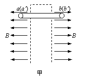 (15分)如图甲所示,在虚线框两侧区域存在有大小为B、方向分别为水平向左和水平向右的匀强磁场。用薄金属条制成的闭合正方形框aa’b’b边长为L,质量为m,电阻为R。现将金属方框水平地放在磁场中,aa’边、bb’边分别位于左、右两边的磁场中,方向均与磁场方向垂直,乙图是从上向下看的俯视图。金属方框由静止开始下落,其平面在下落过程中保持水平(不计空气阻力)。