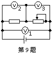 9.如图所示的电路中,三个电压表对应的读数分别为U1、U2、U3,若移动滑动变阻器滑片后,三个电压表读数改变量的绝对值分别为ΔU1、ΔU2、ΔU3,则[ ]