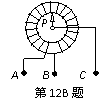12B.如图所示,为一种可调压自耦变压器的结构示意图,线圈均匀绕在圆环型铁芯上,若AB间输入交流电压220V,则转动滑动触头P,在BC间可获得的输出电压范围是 ;当滑动触头P转在图示位置时,于BC间接一个55Ω的电阻(图中未画出),流过电阻的电流应接近于 。