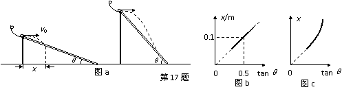 17.(6分)如图a是研究小球在斜面上平抛运动的实验装置,每次将小球从弧型轨道同一位置静止释放,并逐渐改变斜面与水平地面之间的夹角θ,获得不同的射程x,最后作出了如图b所示的x-tanθ图象,则: