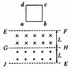 两个沿水平方向且磁感应强度大小均为B的有水平边界的匀强磁场,如图所示,磁场高度均为L。一个框面与磁场方向垂直、质量为m,电阻为R,边长为L的正方形金属框abcd,从某一高度由静止释放,当ab边刚进入第一个磁场时,金属框恰好做匀速直线运动;当ab边下落到GH和JK之间的某位置时,又恰好开始做匀速直线运动。整个过程空气阻力不计。