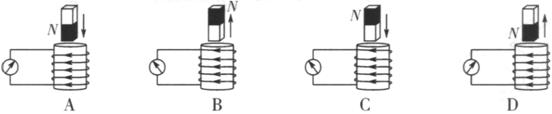 8、下图是验证楞次定律实验的示意图,竖直放置的线圈固定不动,将磁铁从线圈上方插入或拔出,线圈和电流表构成的闭合回路中就会产生感应电流。各图中分别标出了磁铁的极性、磁铁相对线圈的运动方向以及线圈中产生的感应电流的方向等情况,其中表示正确的是 ( )