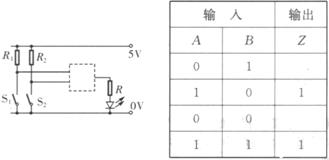 10、(6分)下图是一个汽车车门报警装置逻辑电路图,图中的两个按钮开关分别装在汽车的两扇门上。只要打开任意一扇门,即电路中任何一个开关处于断开状态,发光二极管就发光报警。清你根据报警装置的要求,在电路图的虚线框内画出门电路符号,并完成该门电路的真值表。
