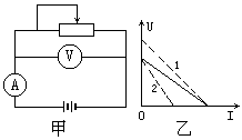 (5分)用电流表和电压表测定电池的电动势和内电阻实验,连接电路如右图甲.根据电路连接情况可以判断I测_____I真,U测____U真.由测量数据作出的U-I图线如图乙所示的虚线_____(其中实线表示真实图线).由乙图可知,由该电路测出的电动势E测和内阻r测与真实值比较E测______E真,r测_____r真.