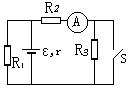 (12分)如右图所示电路,R1=12Ω,R2=8Ω,R3=4Ω,开关S断开时,电流表示数为0.5A,开关S闭合时,电流表示数为0.72A.求电源电动势和内电阻.