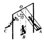 (12分)如右图是打秋千的示意图.最初人直立站在踏板上(A点所示),绳与竖直方向成θ角,人的重心到悬点O的距离为L1;从A点向最低点B运动过程中,人由直立状态自然下蹲,在B点人的重心到悬点O的距离为L2;在最低点处,人突然由下蹲状态变成直立状态(人的重心到悬点O的距离恢复为L1)且保持该状态到最高点C.设人的质量为m,踏板和绳的质量不计,空气阻力不计.求:人首次到达左端最高点C时,绳与竖直方向的夹角α.