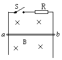 R=2Ω的电阻,导轨相距d=0.5m,一根质量m=5.0×10-3kg的金属棒ab紧贴在导轨上无摩擦地下滑,不计导轨和金属棒的电阻,有一磁感应强度B=0.1T的匀强磁场垂直于导轨平面。当ab棒从静止开始下落1.6s后突然闭合开关S,g=10m/s2.求: