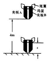 (14分)在头脑奥林匹克竞赛中,有一个叫做“保护鸡蛋”的竞赛项目,要求制作一个装置,让鸡蛋从两层楼的高度落到地面且不被摔坏.如果没有保护,鸡蛋最多只能从0.1 m的高度落到地面而不被摔坏.有一位同学设计了如右图所示的一个装置来保护鸡蛋,用A、B两块较粗糙的夹板夹住鸡蛋,A夹板和B夹板与鸡蛋之间的摩擦力都为鸡蛋重力的5倍,现将该装置从距地面4m的高处落下,装置着地时间短且保持竖直不被弹起.求: