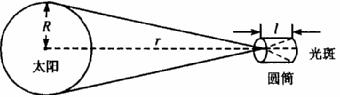 在地面上某处,取一个长l=80cm的圆筒,在其一端封上厚纸,中间扎直径为1mm的圆孔,另一端封上一张画有同心圆的薄白纸,最小圆的半径为2.0mm,相邻同心圆的半径相差0.5mm,当作测量尺度,再用目镜(放大镜)进行观察。把小孔正对着太阳,调整圆筒的方向,使在另一端的薄白纸上可以看到一个圆形光斑,这就是太阳的实像,为了使观察效果明显,可在圆筒的观测端蒙上遮光布,形成暗室。若测得光斑的半径为