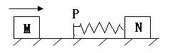 如图所示,质量相等的两个滑块位于光滑水平桌面上。其中,弹簧两端分别与静止的滑块N和挡板P相连接,弹簧与挡板的质量均不计;滑块M以初速度V0向右运动,它与挡板P碰撞(不粘连)后开始压缩弹簧,最后,滑块N以速度V0向右运动。在此过程中: