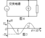 正弦交变电源与电阻R、交流电压表按照图4所示的方式连接,R=10Ω,交流电压表的示数是10V,图5是交变电源输出电压u随时间t变化的图象.则( )
