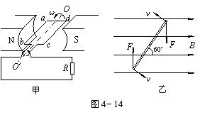 17.如图4-14甲所示,一线圈边长L=ab=40cm,L′=bc=20cm,匝数N=100,绕通过ad与bc的中点的轴OO′以角速度ω逆时针方向转动,设匀强磁场的磁感强度B=1.5T,转动轴OO′与磁感线垂直,矩形线圈的总电阻r=1Ω,外电阻R=1Ω。其它电阻不计。若已知线圈所受到磁场力的最大力矩为Mmax=7.2N·m,求:(1)感应电动势的最大值。(2)线圈转动的角速度。(3)线圈从图示位置转过90°时,感应电动势的平均值。(4)在线圈转动一周的过程中,电路所产生的热功率。(5)当线圈平面与磁感线夹角为60°时(如图4-7乙所示),所受的磁力矩。