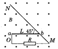 如图3-110所示,一根足够长的粗金属棒MN固定放置,它的M端连一个定值电阻R,定值电阻的另一端连接在金属轴O上,另外一根长为l的金属棒ab,a端与轴O相连,b端与MN棒上的一点接触,此时ab与MN间的夹角为45°,如图所示,空间存在着方向垂直纸面向外的匀强磁场,磁感强度大小为B,现使ab棒以O为轴逆时针匀速转动半周,角速度大小为ω,转动过程中与MN棒接触良好,两金属棒及导线的电阻都可忽略不计.
